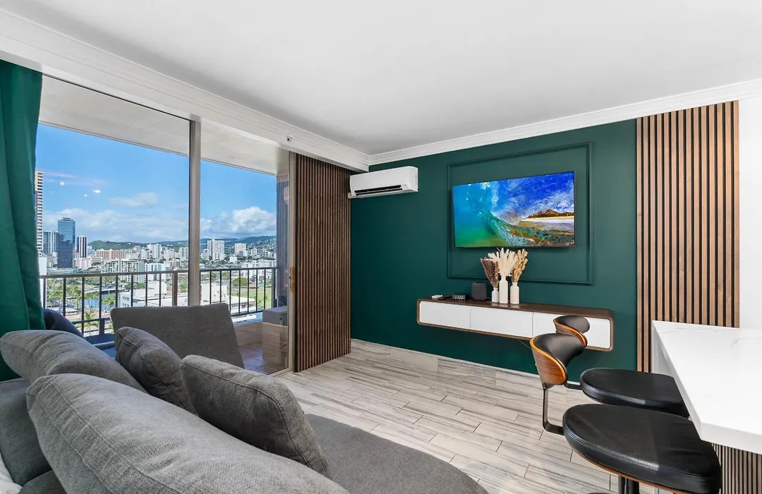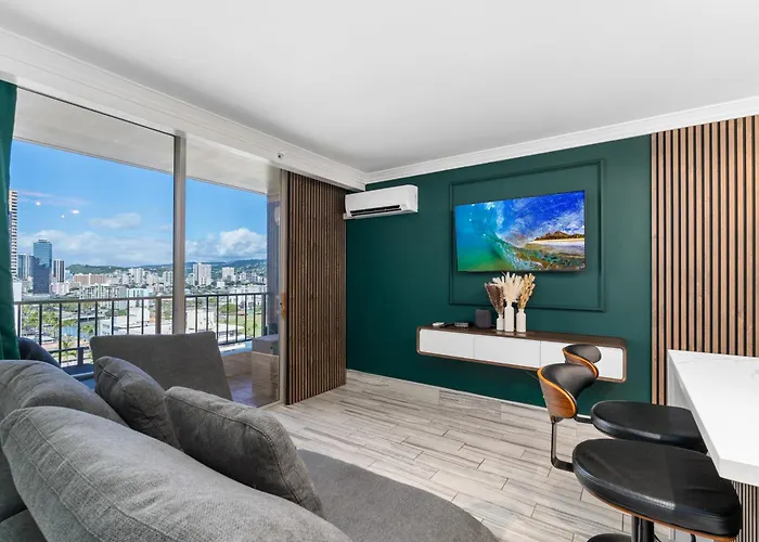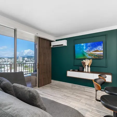 32m²のModern Suite Free Parking View Ac King Bed Kitchen ホノルルは庭園の景色を見渡せる場所にあり、アラワイ運河から歩いて5分の場所にあります。 国立太平洋記念墓地はアパート少し離れたで、ワイキキ スターライト ルアウから1.1km先にあります。